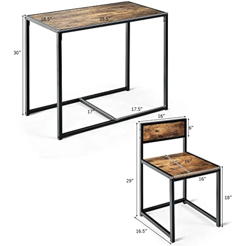 This dining set is designed for both durability and efficiency. The tabletop and chair seats have a rich, rustic wood grain that adds a touch of warmth to the minimalist design. The chairs are crafted with a low backrest, providing support without adding visual bulk, and their seats are designed to tuck neatly under the table when not in use. The sturdy metal frames ensure stability and long-lasting use. This set offers a practical and fashionable option for those with limited space.
