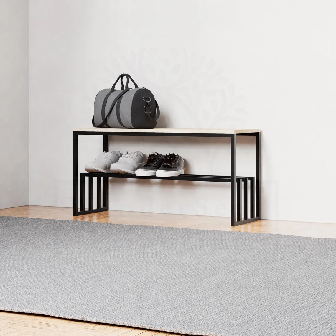 This multi-purpose bench seamlessly blends minimalist design with industrial durability, making it an ideal addition to any entryway, mudroom, or closet. The sturdy black metal frame provides a strong foundation, while the light wood-finished top serves as a convenient seat for putting on shoes. A lower metal rack offers ample space to organize and store footwear, keeping your entryway tidy and clutter-free.