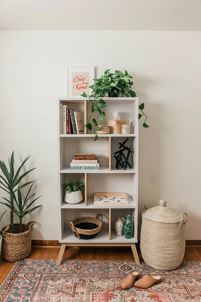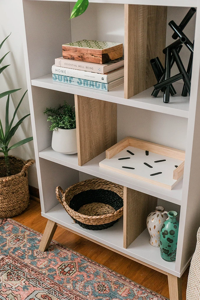 The Zig Zag Modern Bookshelf is a visually striking and highly functional furniture piece. The innovative interior shelving creates a variety of differently sized and shaped compartments, ideal for holding books, decorative items, and baskets. The mix of solid white and light wood finishes adds a playful yet sophisticated touch, allowing it to fit into both minimalist and eclectic decor styles. Constructed from durable engineered wood, this bookshelf stands on a solid wood base with flared legs, ensuring stability and long-lasting use.
